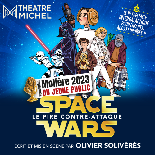 Afficher le planLa 1ère Parodie Intergalactique pour Enfants, Ados et Droïdes est de retour ! *** Après les succès d’Ados, du Bossu de Notre Dame, d’Au Pays du Père Noël ou encore de Chevaliers Princesse et Dragon, Olivier Solivérès nous embarque à travers la galaxie dans un spectacle d’aventure et d’humour pour toute la famille ! Dans un décor en vidéo 3D, vous retrouverez 5 comédiens aux multiples facettes, des robots aux écrous qui suintent, des sabres lasers avec et sans piles, un poireau et même, pour la 1ère fois dans un spectacle jeune public : de véritables hologrammes ! *** Dans la navette impériale du Seigneur Bad Bador, la Princesse Sheila tente d’échapper aux Soldats de l’Empire qui sont à sa poursuite… Avant d’être rattrapée, elle parvient à envoyer un appel à l’aide à son vieil ami Obione Two Three. Ce dernier décide alors avec le soutien de son jeune disciple, Jean-Luc Walker, de partir à son secours. Parviendront-ils à la libérer ? Pourquoi Bad Bador s’en prend-il à la Princesse ? La vitesse lumière fonctionne-t-elle dans le noir ? Superman a-t-il des slips rouges de rechange ? Et surtout Jean-Luc Walker trouvera-t-il la force… d’arrêter sa crise d’adolescence ? Vous trouverez toutes les réponses à ces questions et bien d’autres encore, en embarquant avec nos héros à bord de notre navette intergalactique direction … « Space Wars !! »